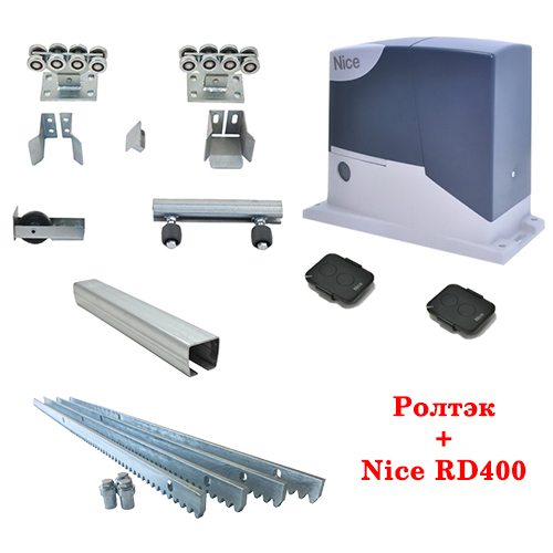 Этот комплект для откатных ворот с автоматикой Nice рассчитан на вес створки ворот до 400 кг. Рекомендуется к установке для проемов ворот, не превышающих 4-4,5 метров. Это надежные комплектующие от именитого производителя Ролтэк, которое будут выполнять свою работу в любых погодных условиях. В комплект для откатных ворот входит: комплектующие для откатных ворот Ролтэк Микро, привод для откатных ворот Nice RD 400 с 2 пультами и 4 м зубчатой рейки.