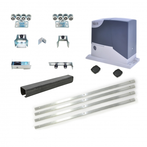 Данный комплект предназначен для ворот с весом до 300 кг и шириной створки до 6 м. В комплект поставки входит автоматика для откатных ворот Nice RD 400 и комплект фурнитуры для откатных ворот с 6-ти метровой направляющей Furniteh XL.